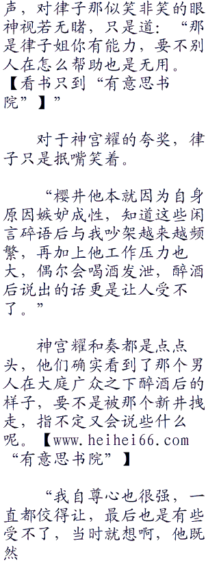 “也就是那时候,樱井开始出现了变化,天天神神叨叨的,不管我去哪都要逼问我,动不动就和我吵架,开始时我还忍让,最后忍无可忍就和他大吵起来,每次吵完架他又像我道歉,弄的我也是无奈。不过他的确是对我不错,我以为他只是嫉妒吃醋害怕失去我,当时就觉得或许只要结婚后就没事了吧,到时候我们踏踏实实的过日子,不行就领养个孩子,一辈子就这样过去也不错,不过我还是太天真了,太小看男人的自尊心了,结婚后他反而更是变本加厉,说话也越来越难听。”