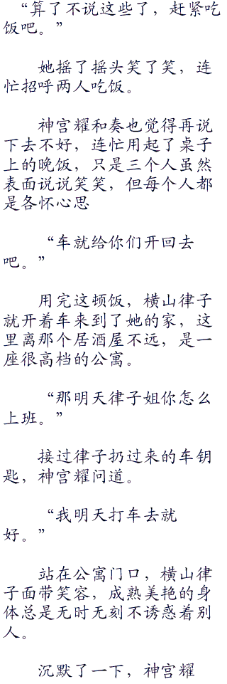 神宫奏身体一僵,她刚才的偷瞟还是被神宫耀发现了,在她大腿上的那只手狠狠的捏了一下她嫩白的软肉,让奏的说话声都是有些紧张。。 ww w ..c o m