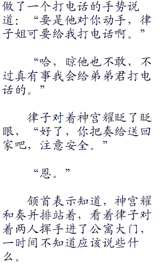律子突然饶有兴趣的看了一眼奏,她扬了扬眉毛道:“那是奏你不了解男人,最开始姐姐我也不了解,等我懂了时,已经什么都晚了。”