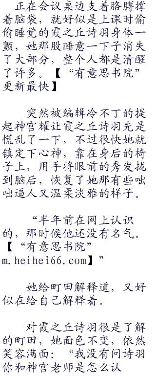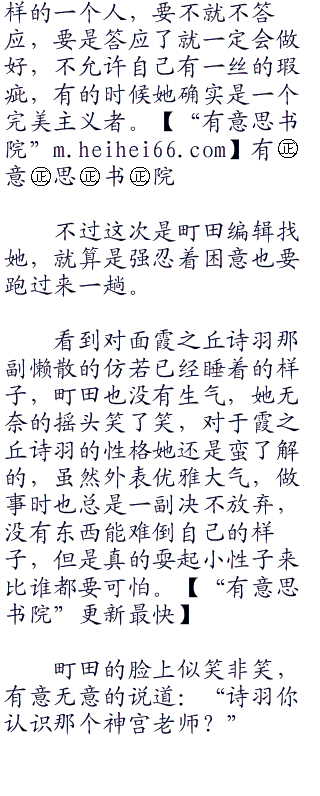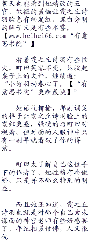 霞之丘诗羽用鼻音轻轻的哼了一声,若是可以的话她现在真的想回去睡觉,好不容易碰到了假期,她的昼夜都是有些颠倒过来,除了在为《恋爱节拍器》接下来的内容构思外,也在为神宫耀所说的白色相簿剧情构思,虽然神宫耀还没有把基本的剧情内容交给她,但是霞之丘诗羽已经开始提前思考了。