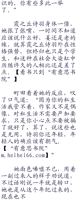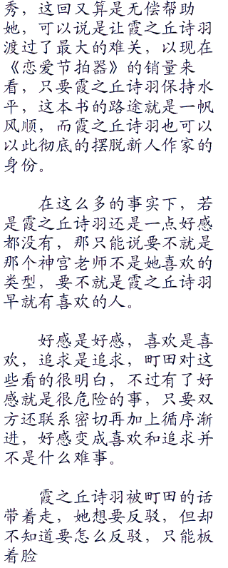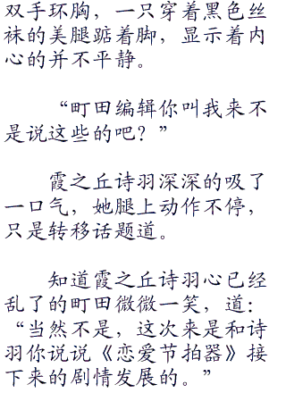 町田编辑已经和她很熟悉了,最开始时还是町田编辑的大力帮助才让《恋爱节拍器》能够出版的,面对这个熟人霞之丘诗羽也没了面对陌生人的亮丽光鲜,让自己最是隐秘的一面暴露了出来。