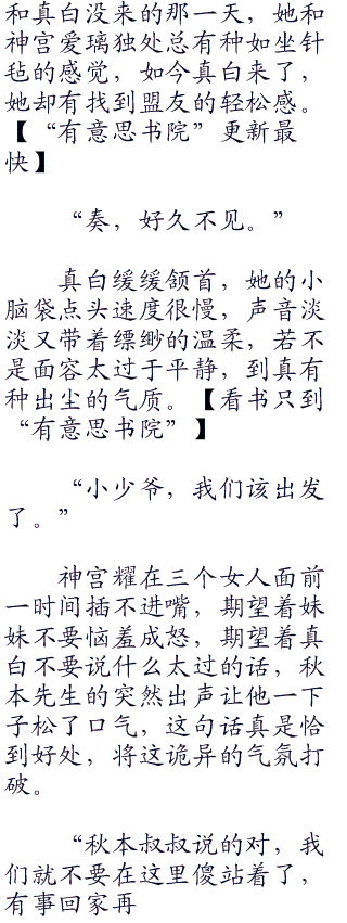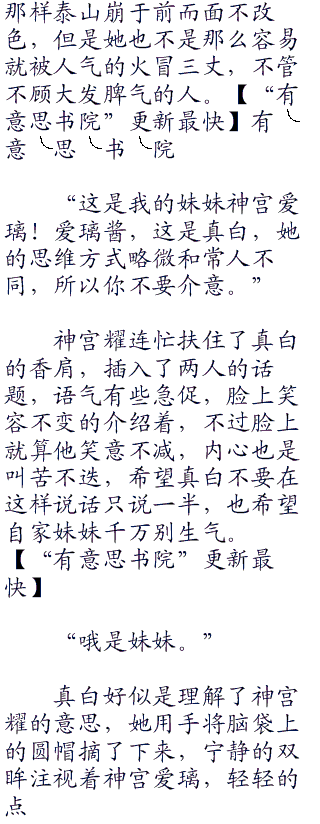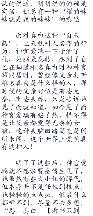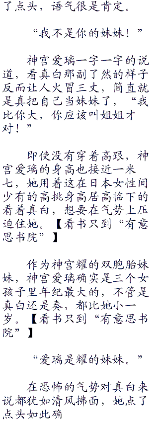 无名怒火从心头升起,听到真白那面无表情的,毫无份感情的话语,神宫爱璃有一种自己被人鄙视,被人嘲讽的感觉,她狠狠的瞪着罪魁祸首,想要用自己的强势让对方投降,只是看着真白那宁静的毫无一丝烟火之气的樱眸,神宫爱璃突然想要泄气。