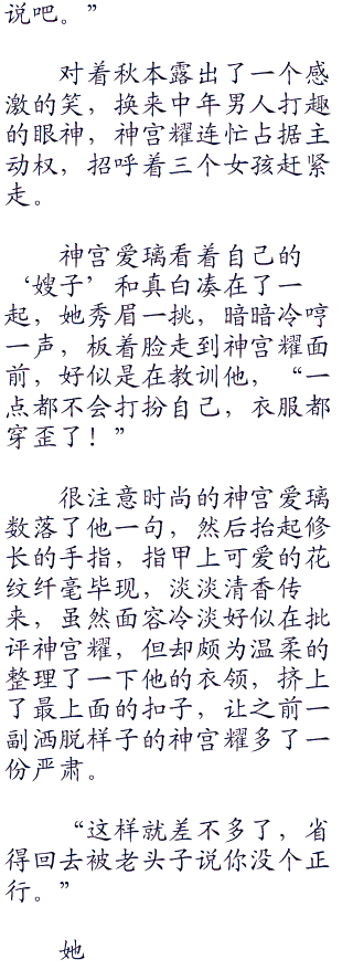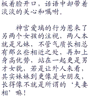 场面安静,落针可闻,喧闹的京都就像是时间被静止了一样,来来往往杂乱的人群再也没有了回声,人流涌动,经过几人的身边,男人惊叹于三个女孩子的美丽,偷偷摸摸的往这边窥来,然后又假装什么事都没发生过一般和旁人说笑。ww.w..c.om