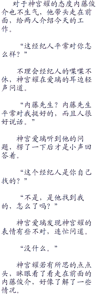 听到爱璃的话,神宫耀却是眉头一皱,因为面前这个正在往这里小跑着的经纪人有些太过于热情了,自家妹妹又不是什么大牌明星能成为这个经纪人的摇钱树,实在是使不得他的这种热情。