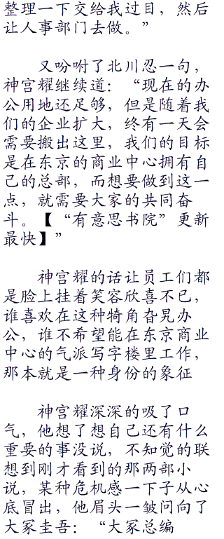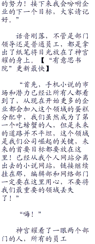 用手往下一压,会议室的员工们都是安静了下来,神宫耀走到自己的座位前,他没有坐下,只是微微鞠躬道:“这几日各位的努力我都看在眼里,辛苦大家了!”