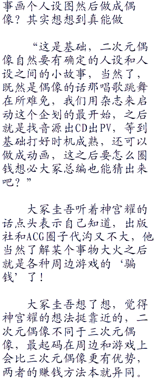 大冢圭吾的脸色有些奇怪,说到‘偶像’总是会让人想到漂亮可爱的小姑娘,唱歌跳舞之类的,而且神宫耀也明确说了是二次元偶像,莫非他们就是在杂志上编个故
