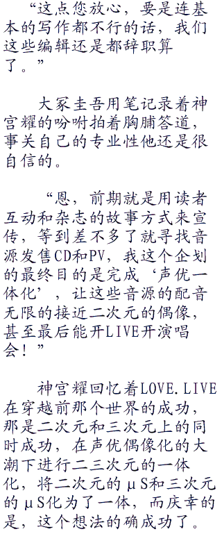 “就像刚才和大冢总编你说的杂志起名为《school.idol》一样,这个企划的名字我决定命名为‘lovelive!school.idol.project’,说的通俗易懂点其实就和做偶像一样,我们做一个二次元偶像!”