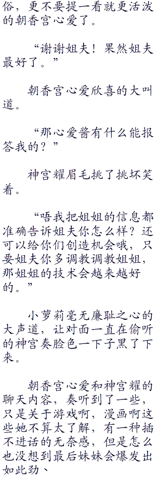 不过这些不是最主要的,最主要的是奏感到了害怕,她好不容易才下定这么大的决心,以这种态度对待神宫耀,真怕自己的妹妹做出一些超出人预料的事,把这好不容易才塑造的氛围再次打破。