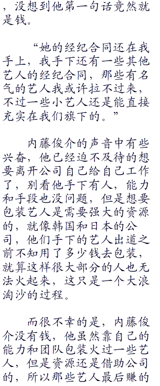 内藤俊介自嘲了一句,就算有能力,有资源,内藤俊介在一些上层人物看来,也就是个弱者,是个小人物,只要稍有不慎就会阴沟翻船,所以他活的很小心,尤其娱乐圈这个地方,更是一脚踩下去颜色混杂不清。