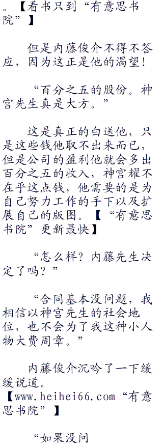 “因为公司的性质问题,前期需要大笔资金投入,所以股份的比例是我持有百分之七十五,你持有百分之二十五。嘛,实际上来说你的那些钱和人力资源仅仅只能占百分之二十的股份分成,但是看在你这么辛苦的份上,那百分之五我就当个人的免费赠送了。”