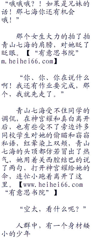 三人站在教学楼的门口谈笑风生,对于四周或羡慕,或讶异的眼神毫不在意,或者说只有真白和神宫耀毫不在意,青山七海还是有些如坐针毡的,当着许多同学的面和‘外校’的帅气学长这样聊天,让她有些害羞。