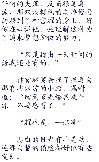 神宫耀知道这是个很是自我努力奋斗的少女,除非是到了万不得已的时候,是绝对不会去像他人寻求帮助的,所以他就多说了两句。