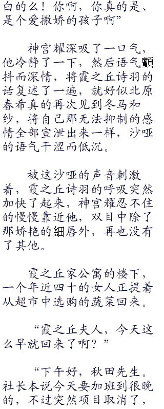 “那么,场景开始,首先,冬马和纱紧紧的抱了上来,而北原春希完全无法拒绝这个行为,只能呆呆的站在那里不,应该是呆呆的坐在那里。”