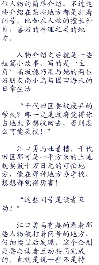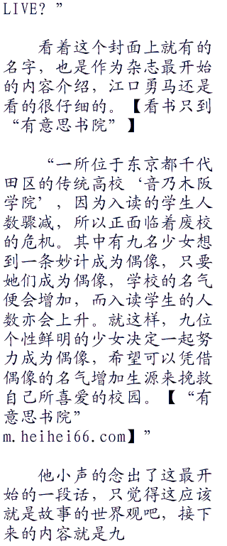 你们有没有买《school.idol》这本杂志?应该是刚刚发行的,里面可有对神宫老师的专访,介绍了许多火影的细节,我刚才看了下,几乎把现在出现过的所有忍术都详细介绍了一遍,还有结印方式!