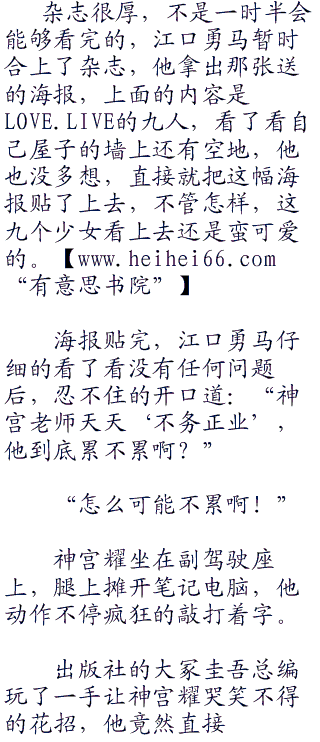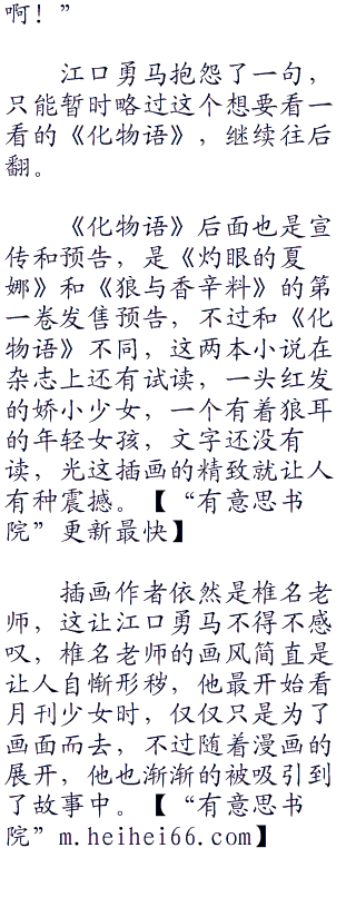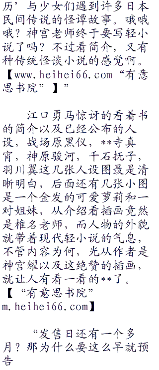 江口勇马在继续翻着这厚厚的第一期杂志时,看到了这么一页,之所以让他停下视线仔细观看,是因为他注意到这本正在做发售预告的小说作者名字是神宫耀。ww w he i co m