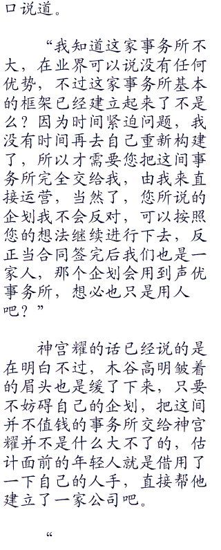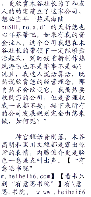 神宫耀的话让木谷高明皱起了眉,他双手环胸暗暗思考着利弊得失,不管怎样这个公司也是他一手建立起来的,也有着两年的心血在内,如今直接被对方以资本收购内心自是有些不快,让他想到了几年前自己被奋斗一生的公司赶出去的情况。