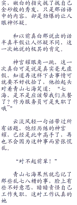 奏轻轻的点了点头,她也知道真白那没有常识的样子,在学校想必会闹出许多事,听到‘七海’在学校颇为照顾真白,就知道这不是一个简单的工作了。