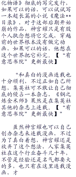 默默的把推特关上,神宫耀打开软件,继续《东方幻想乡》的创作,好消息是这部作品终于要完成了,神宫耀可以说是绞尽脑汁完成的这个黑历史作品,浪费的精力可以说是几项工作中最多的,其他的工作他最多只要改改东西,烙上属于自己的印记就够,而这部作品完全就是从无到有没有任何的借鉴,彻底的属于自己的幻想乡前传。
