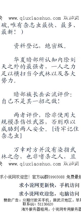 ;;;;华夏暗部所认知内的最恐怖强者,一人之力怕已足以横扫当今武林以及各大势力。