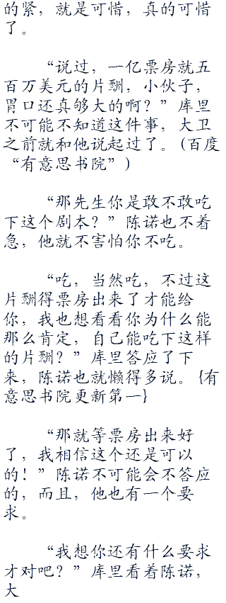 “绿巨人最终的票房不超过两亿票房的话,你给我一万编剧就好;美队的票房不超过三亿的话,你可以不用给我片酬;雷神的最终票房不超过四亿的话,你们拍这电影的成本是多少,我陈诺来主动承担,而且也不会要你们一分钱!”陈诺明白大卫这话是什么意思,无非就是要陈诺表现出他的信心。