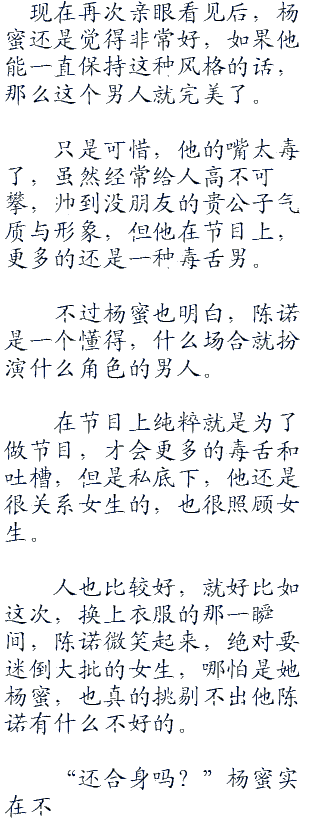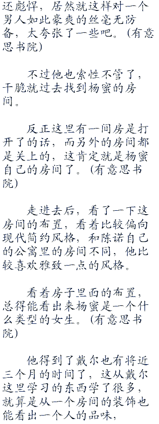 “不不是,我我”陈诺一时之间竟说不出话来,随后无力道:“蜜姐你到底是对我多放心啊?居然连你的闺房都能让我一个大男人随便进去?”