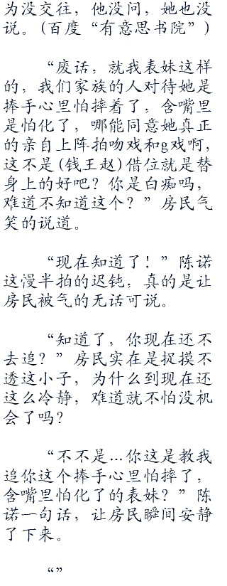 “靠,你丫的还真的同时交往了两个?”房民听了后,吃惊的看着陈诺,同时也紧张的看着自己的表妹。