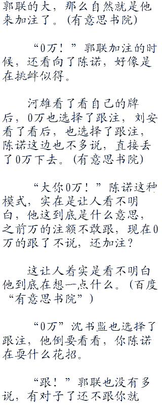 尤其是他的下家沈书盟,完全搞不明白他这是什么意思,但还是选择了跟0万,看他要干嘛。