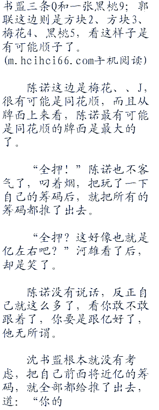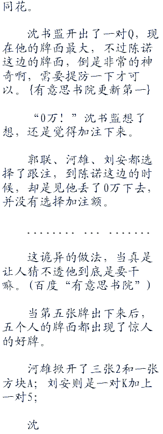 荷官开始发牌,陈诺坐在第三位,右手边是刘安和河雄,左手边是沈书盟和郭联,他们都算是分开来坐的了。