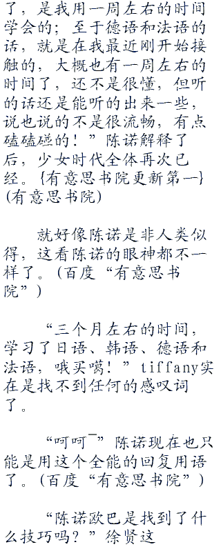 “学习韩语才一个月不到就能和我们这样聊天了?”tiffany感觉自己被打击的好严重,现在她说韩语都不敢说能说的全部都对了。百度