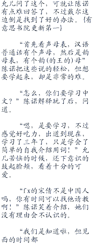 “”陈诺不知道要怎么回答才好,无奈的看着允儿。