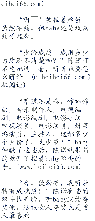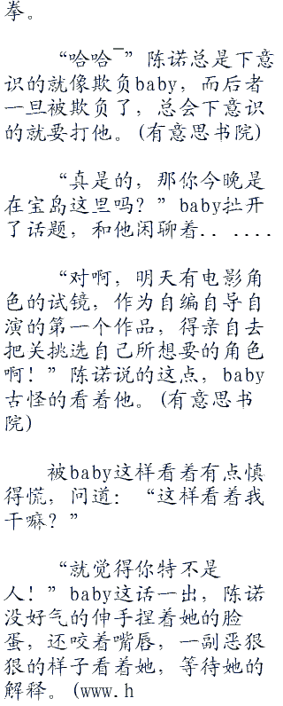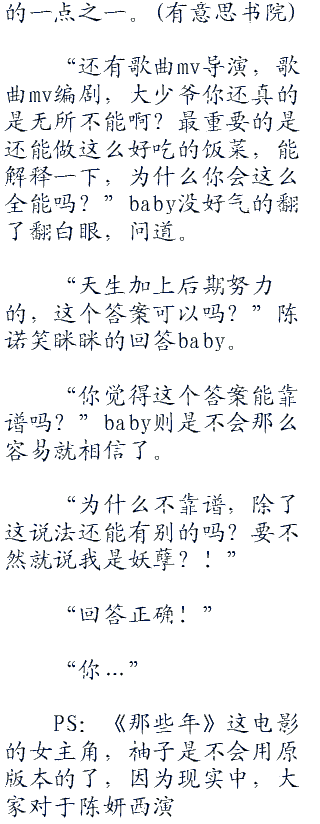 不过听了baby的建议,陈诺就可以把陈妍西淘汰了,就算真的找不到合适的角色,那么也要和自己的女友来出演情侣档才行,总之陈妍西是不用了。