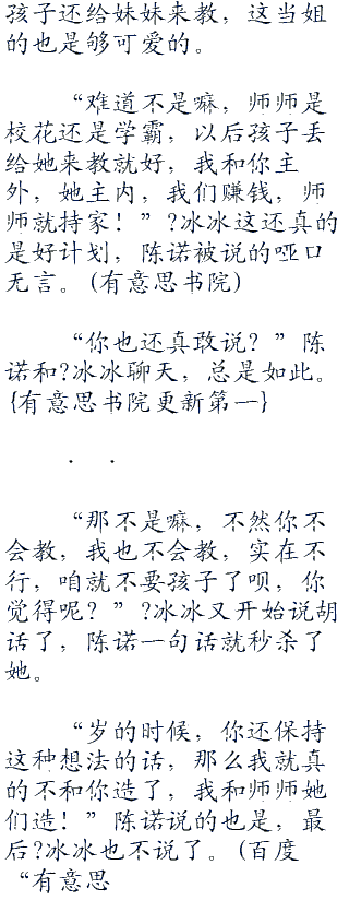 “嘿,我说你怎么这么不识好歹啊,我给你安排一个妻子,你还不乐意了是不是?要是不乐意就退出节目吧!”?冰冰笑眯眯的样子,陈诺要是看见了,肯定要大骂妖精了。