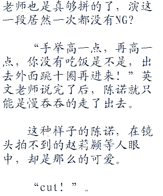 现在拍摄的进度,已经到了上英文课这里,赵莉颍饰演的沈佳宜因为没有带课本,而已经因为上课打手枪调换座位,坐到沈佳宜前面柯景腾,却是非常够义气的把自己的英文书给了沈佳宜,然后自己站了起来,接受全班同学和老师的呵斥,最后还被惩罚,