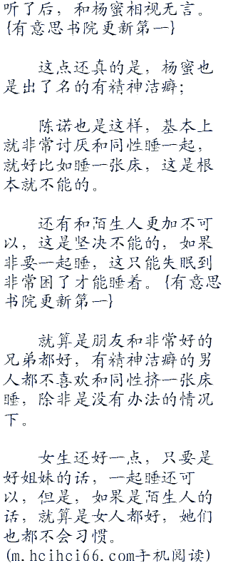 “你觉得我会随便和一个陌生睡一张床吗?我们是有精神洁癖的好不好?”杨蜜这么说,也就说到了点子上面了。