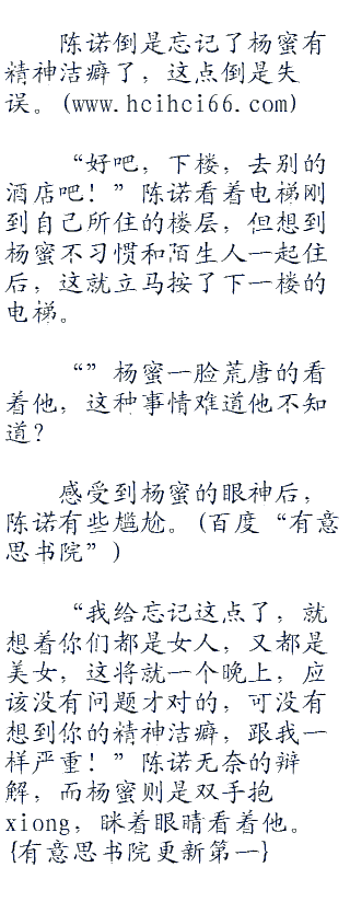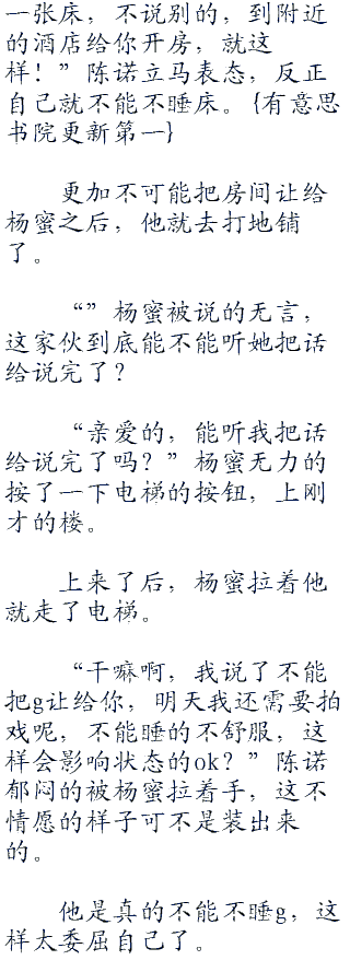 “和我一个房间呗,反正g够大,躺下你也不是问题!”陈诺走进电梯后,坏笑的对杨蜜挤眉弄眼的。