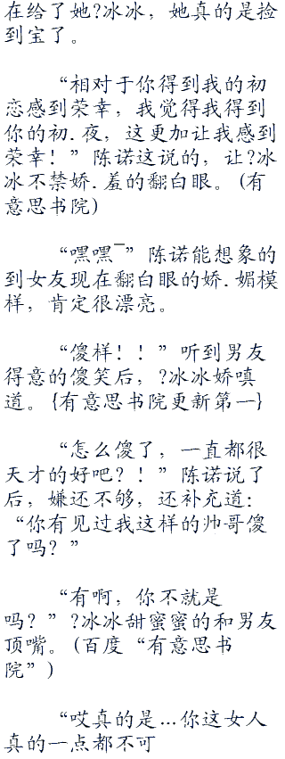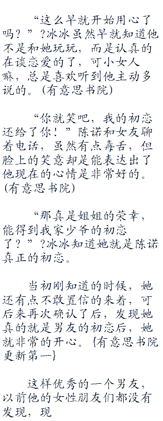 “再说,你都可以允许我花.心,为什么我就不能为了你,设计出一套惊.艳全球的时装秀?”陈诺说起这个,?冰冰更加的满足。