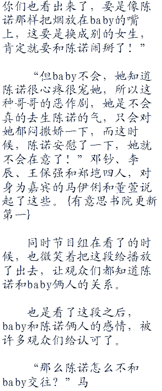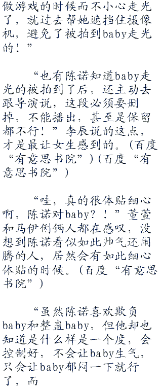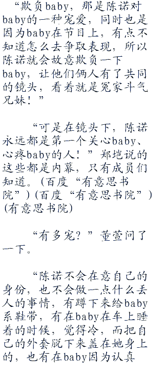 “呵呵~其实在镜头下,陈诺是最疼baby的一个,说是疼都觉得有点不够,可以说是宠溺都不为过了!”邓钞和王保强俩人笑了起来。