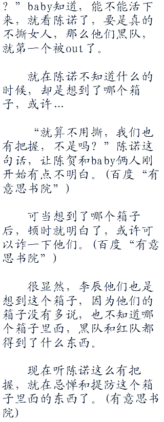 要是陈诺真的不撕女人的话,那么他面对她就没有了攻击力,同时陈贺又是最弱的一个男人,baby一个女生,不管是谁都能搞定了不是吗?