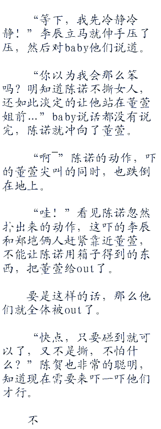 “噗哧!”陈贺的这种表情,眼神中透露着的幸灾乐祸,baby看了后,实在是忍不住。