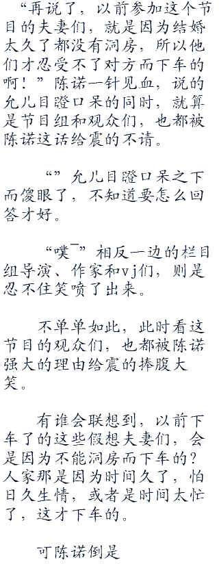 陈诺这样子,就算是扛着摄像机拍摄的vj们都被陈诺的痴心妄想给逗笑了。