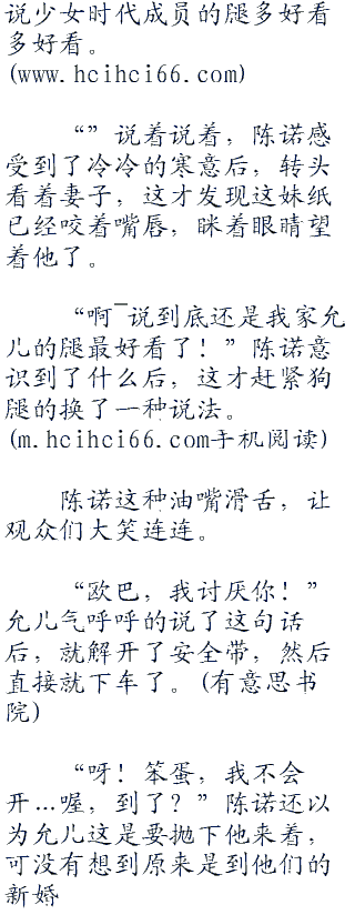“甚至我发现了一个问题,徐贤的两条腿,好像还是我喜欢的类型,这个mv我看了不下一百次,少女时代九个人的腿,我就喜欢徐贤的!”陈诺说了后,允儿立马停下车子,抓头眯着眼睛看着他。