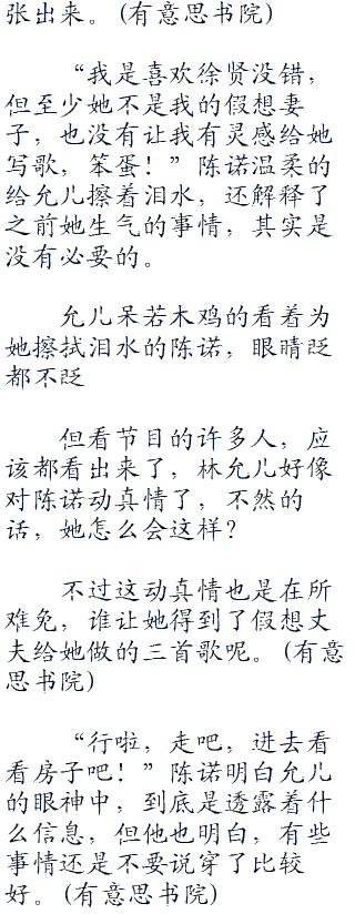 陈诺自然感觉到了允儿这样子,所以唱了这一段就没有唱下去了,而是打开了他拿着允儿的包包,找到了纸巾,抽了一