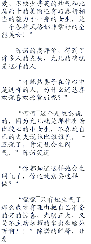 “生闷气的时候,就想着这男人太讨厌了,没有眼力价,几次三番的夸奖别人比自己的妻子好,太讨厌了!”允儿说着的时候,还下意识的咬着下唇,一脸的可爱。