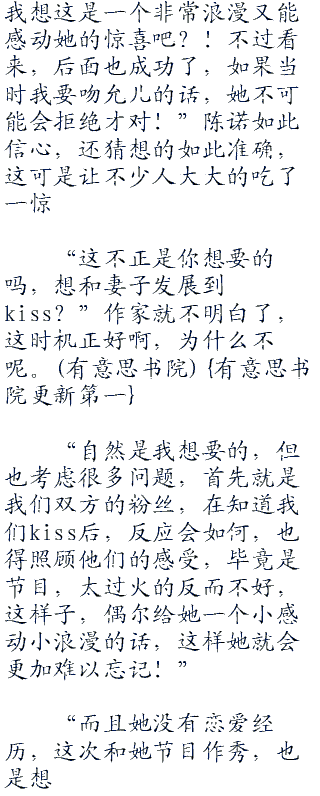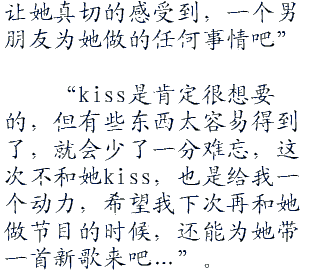 “嗯!其实是很纠结的,不过前两次,他给我准备歌曲的时候,当时是真的很感动,如果那时候,他要和我kiss的话,我想我也不会拒绝的,但他没有,所以我也没说!”允儿把自己最真实的回答,告诉了作家。