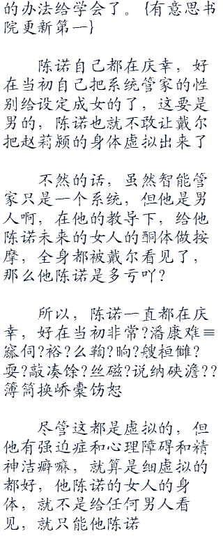 是的,陈诺非常无耻的让戴尔虚拟出了赵莉颍的身体,再戴尔这个女性智能管家的教导下,把这套按摩