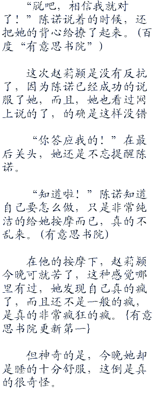 陈诺给她普及了这些常识后,将她拉入怀中后,让她斜躺着,后背靠着他xiong膛,然后给一只手她枕着,空出来的手,则是用手机上网,查找了一些资料,俩人一起看看这些女人晚上睡觉的习惯。