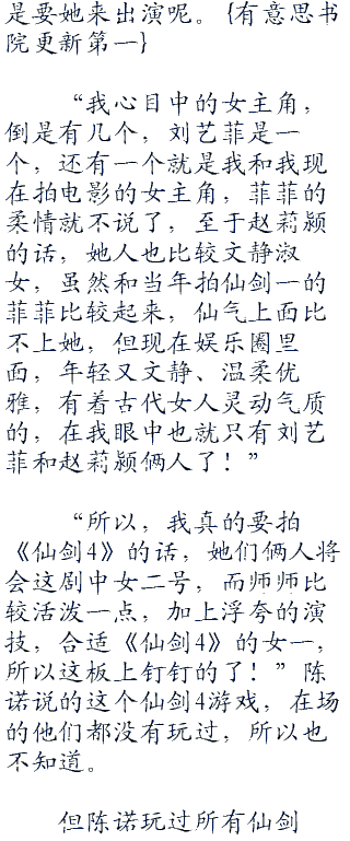“好比如这样说,你们的演技到了,但是特效跟不上,这整个画面,看着流畅和真实吗?”陈诺这说的,都是自己看过了未来的一些仙侠电视剧后,自己想出来的。