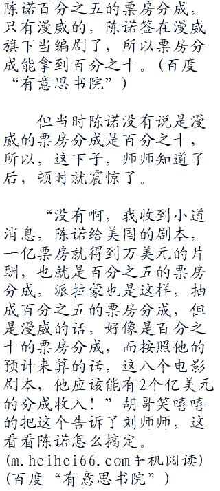“我知道他写了八个剧本给美国三个电影制作公司,我知道是一亿票房就万的片酬,但你当初不是说只有一亿左右而已吗?怎么就成了两亿?”刘师师的确是不知道这个,当初陈诺说漫威的片酬,那是说了票房的百分之五的分成而已,而不是百分之十。