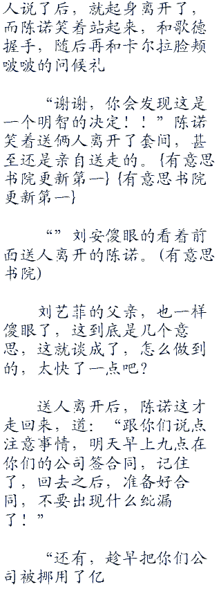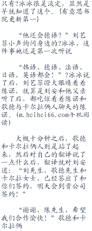 ?冰冰和刘艺菲俩人,也非常识趣的站起来离开,这种谈生意的,她们自然也会避开,所以就可以暂时到套间外。