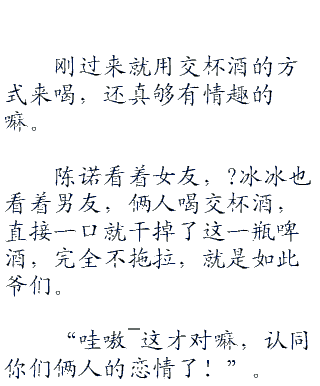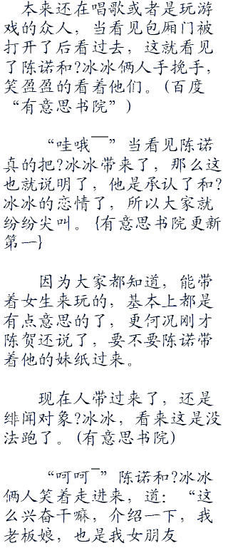 ?冰冰挽着男友的手臂,陈诺推开了包厢门,也没有走进去,看着在包厢里面high起来的众人。